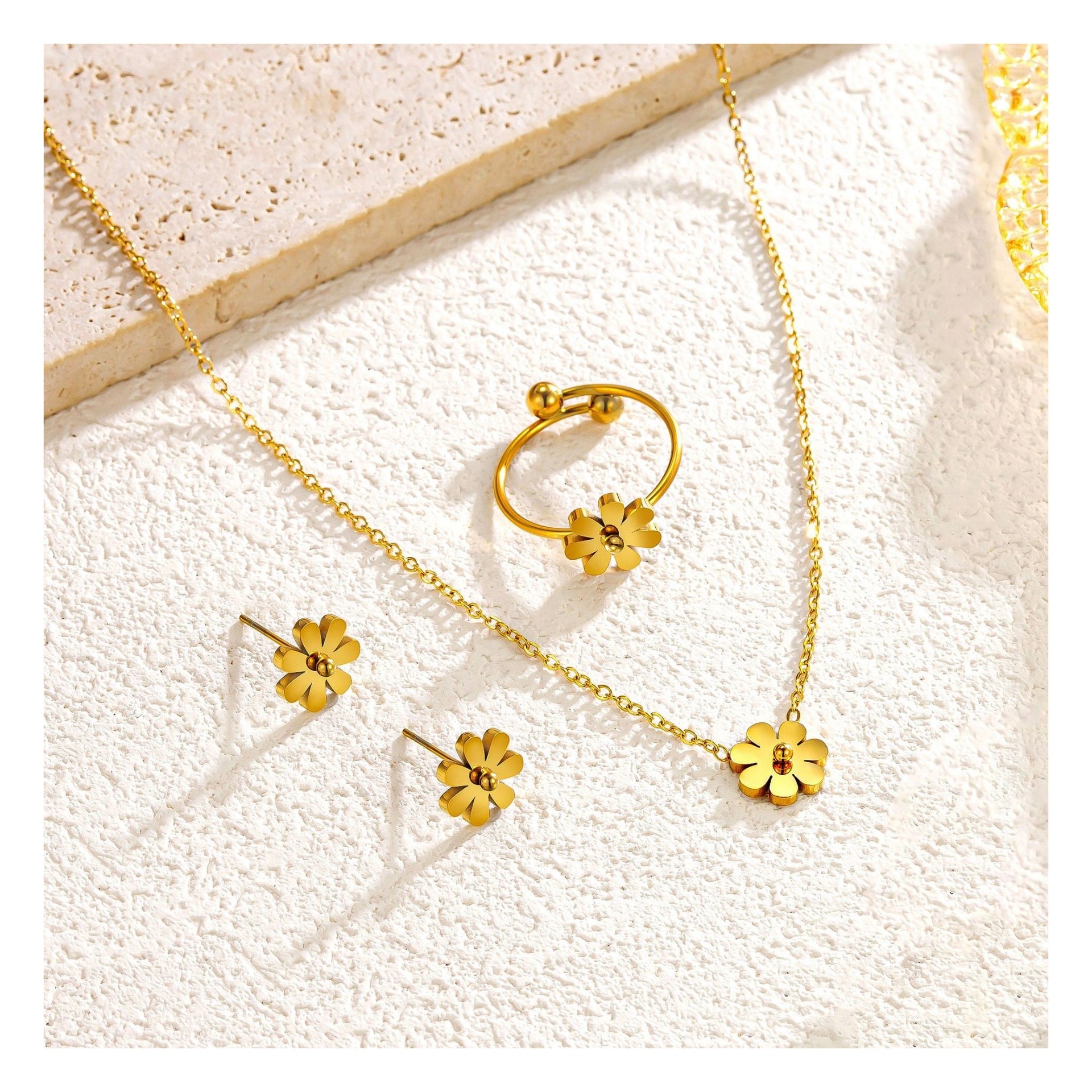Fashion Daisy Sunflower Necklace Earrings Ring Set 18K Stainless Steel Women's Simple Sunflower Necklace
